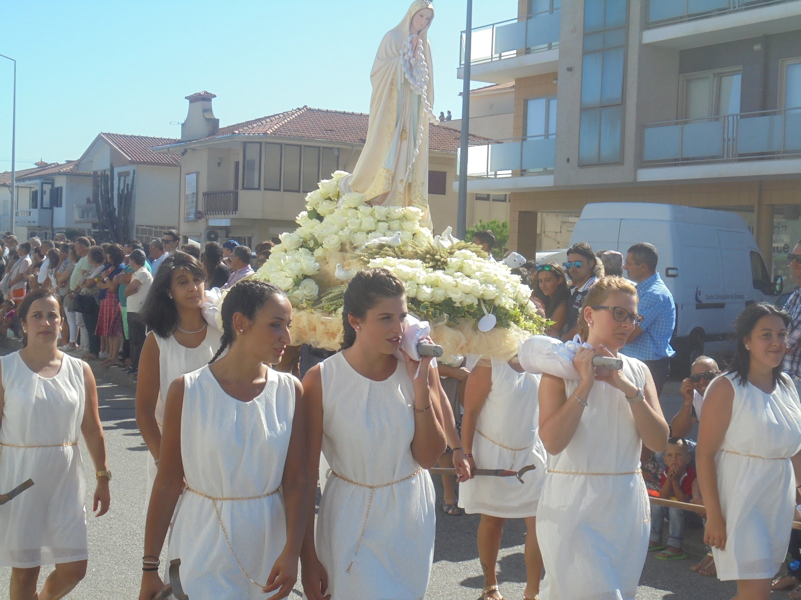 Decorreu na tarde deste Domingo, dia 28 de Agosto, a procissão em honra do Nosso Senhor dos Aflitos e da Nossa Senhora da Boa Viagem que partiu da Igreja Matriz de Esmoriz rumo à Capela da Praia. Durante o trajecto delineado (Avenida da Praia, Avenida Joaquim Oliveira e Silva, Avenida da Barrinha e Avenida Infante D. Henrique), muitos foram os cidadãos que fizeram questão de estar presentes para demonstrarem a sua devoção cristã. O momento alto decorreu por volta das 17 horas com a bênção ao mar assegurada pelos padres Fernando Campos e Paulo Bladek. Foram várias as dezenas de andores que desfilaram pelas artérias urbanas de Esmoriz, cada uma delas consagrada a um santo ou patrono, além de todas elas exibirem cores vivas. Em seguida, apresentamos a nossa reportagem fotográfica sobre os principais momentos desta procissão.